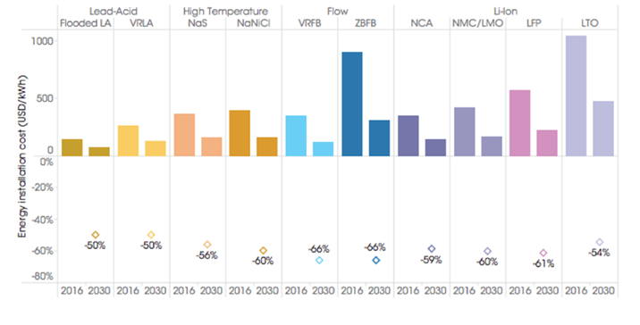 مطالعهٔ شرکت Lazard که در دسامبر ۲۰۱۶ منتشر شد نشان داد هزینههای بیشتر فناوریهای ذخیرهسازی باتری کاهش یافته است، اگرچه هزینهها بسته به نوع فناوری و کاربرد خاص آن متفاوتاند.به عنوان مثال، هزینه سرمایهای باتریهای لیتیوم-یون نسبت به مطالعهٔ قبلی Lazard در سال ۲۰۱۵ ۲۴ درصد کاهش یافته و به محدوده ۳۸۶ تا ۹۱۷ دلار به ازای هر کیلوواتساعت رسیده است.جدول زیر خلاصهای از هزینه سرمایهای فعلی سایر فناوریهای ذخیرهسازی را نشان میدهد: