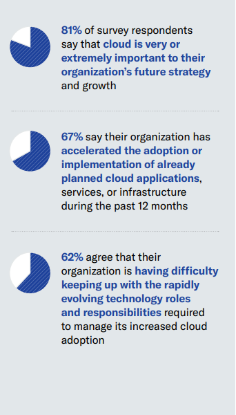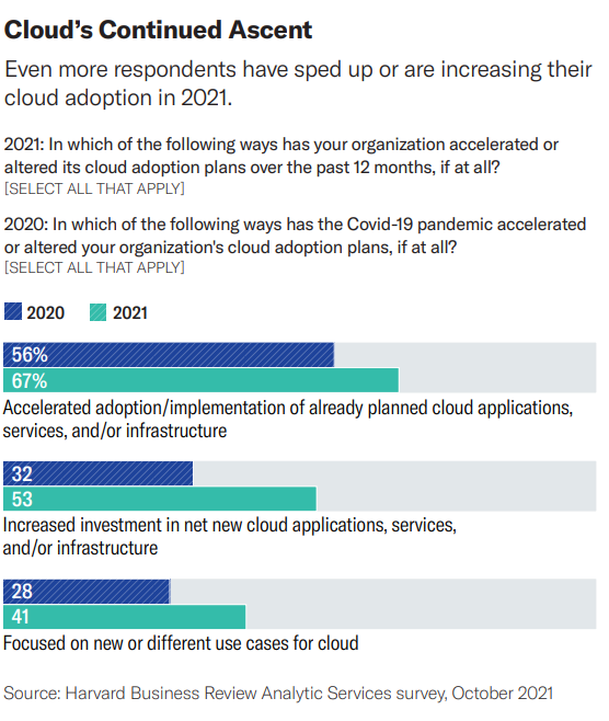 ۶۷٪ از پاسخدهندگان میگویند سازمان آنها در ۱۲ ماه گذشته اجرای برنامهها، خدمات یا زیرساختهای ابری از پیش برنامهریزیشده را با سرعت بیشتری پیش برده است؛ این رقم سال قبل، ۵۶٪ بود. )همچنین ۵۳٪ اعلام کردهاند که سرمایهگذاری در برنامهها و زیرساختهای کاملاً جدید ابری را افزایش دادهاند؛ در حالی که سال قبل تنها ۳۲٪ این کار را انجام داده بودند.