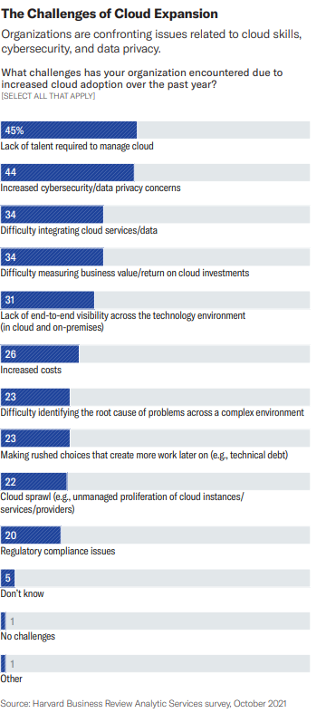 بزرگترین مشکلها مربوط به کمبود نیروی متخصص در حوزه ابر و افزایش نگرانیها درباره امنیت سایبری و حفظ حریم خصوصی دادهها است.طبق گفتهی پاسخدهندگان سازمانهایی که طی سال گذشته سرعت پذیرش ابر را افزایش دادهاند، مهمترین چالشهایی که با آن روبهرو هستند عبارتاند از: کمبود استعداد و متخصص ابری (۴۵٪)، و نگرانیهای روبهافزایش درباره امنیت سایبری و حریم خصوصی دادهها.