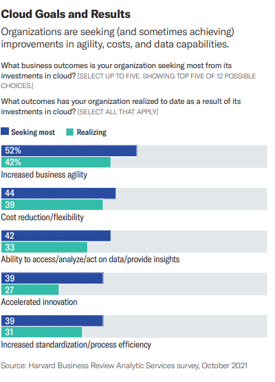 وقتی از آنها خواسته شد پنج نتیجهی اصلی مورد انتظار از رایانش ابری را انتخاب کنند، «چابکی کسبوکار» همانند سال ۲۰۲۰ در رتبه اول قرار گرفت. کمی بیش از نیمی از پاسخدهندگان (۵۲٪) آن را در فهرست پنج اولویت خود جای دادهاند—این نتیجه، محبوبترین هدف امسال بوده است.