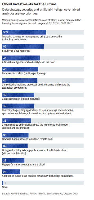 طبق نتایج نظرسنجی، بهبود استراتژی داده مهمترین اولویت ابری برای آینده نزدیک است. بیش از نیمی از پاسخدهندگان (۵۵٪) گفتهاند که طی دو سال آینده تمرکز و سرمایهگذاری اصلی آنها بهبود استراتژی مدیریت و استفاده از داده در سراسر محیط فناوری خواهد بود.