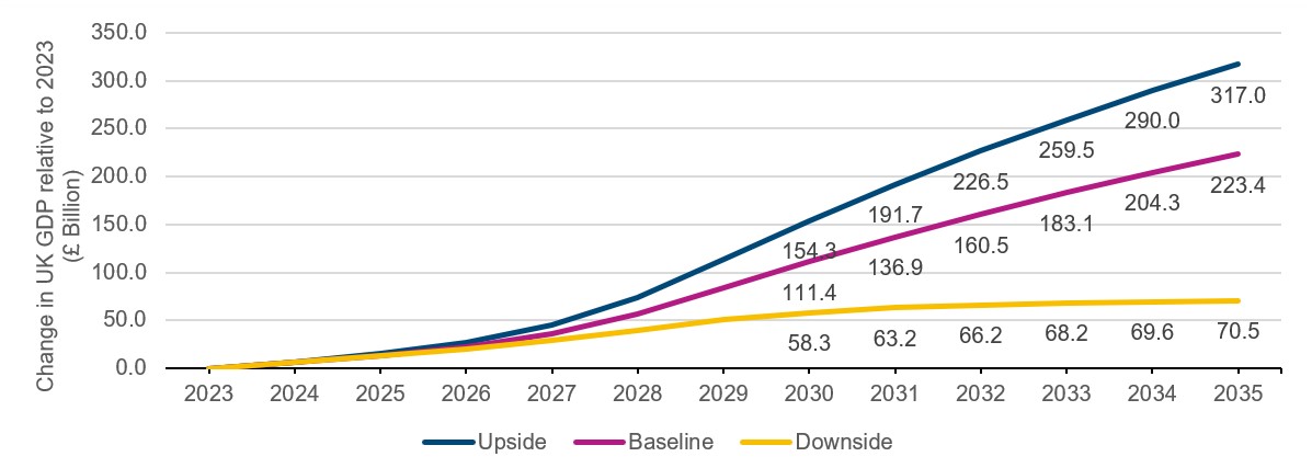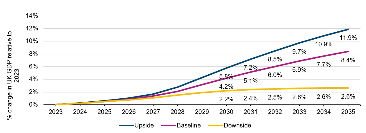 تصویر بالا، میزان رشد پیشبینیشده تولید ناخالص داخلی واقعی بریتانیا را تا سال ۲۰۳۵ نشان میدهد. این رشد ناشی از بهکارگیری ۱۵ فناوری نوظهور در سه سناریوی مختلف (خوشبینانه، پایه و بدبینانه) و نسبت به تولید ناخالص داخلی سال ۲۰۲۳ محاسبه شده است.