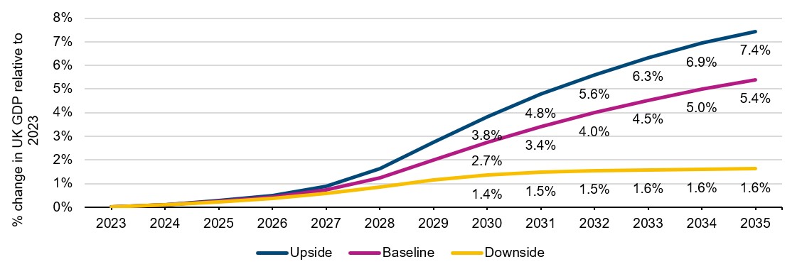 تصویر بالا، رشد واقعی تولید ناخالص داخلی بریتانیا را تا سال ۲۰۳۵ نشان میدهد که بر حسب درصد بیان شده است. این رشد ناشی از بهکارگیری ۵ فناوری نوظهور کلیدی در سه سناریوی مختلف و نسبت به سال ۲۰۲۳ محاسبه شده است.